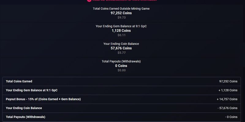 Außerdem bekommt ihr die Coins mit einem Aufschlag von 15% zurück, auch die vorhandenen Gems werden im Verhältnis 9 zu 1 in Coins umgewandelt. Die Auszahlung erfolgt dann wöchentlich aus einem Pool. Eine detaillierte Auflistung und Berechnung eurer Coins sowie die offizielle Stellungnahme findet ihr jetzt auf der Cointiply Seite unter „Mining Game“. Als Grund werden schwerwiegende Fehler bei der ursprünglichen Umsetzung und der Infrastruktur des Mining Games genannt, der Betrieb der ganzen Cointiply Faucet Seite wäre sonst auf Dauer nicht mehr möglich gewesen.